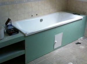 Участок под ванной оформляют защитными панелями, чтобы скрыть коммуникации, улучшить дизайн сантехузла, а также получить дополнительную площадь для хранения хозяйственных мелочей и бытовой химии. Вариантов готовых экранов на рынке стройматериалов довольно много, на любой вкус и бюджет. Для изготовления таких конструкций используют пластик, гипсокартон, металл, влагостойкие МДФ, OSB и прочие материалы.