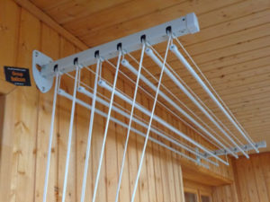 • Многофункциональность. Шнуры крепятся к блоку, оснащенному роликами. Рейки можно регулировать по высоте, выстраивать каскадом, а при необходимости повесить или снять белье достаточно опустить трубки до уровня пояса или поднять их наверх без вспомогательной мебели (лестниц, табуретов, стульев);