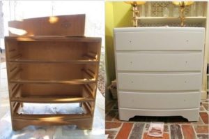 Для отделки видимых частей (корпус, фасады, полки) можно использовать обои, водоэмульсионную краску, лаки либо провести реставрацию деревянной мебели своими руками, применяя технику декупажа.